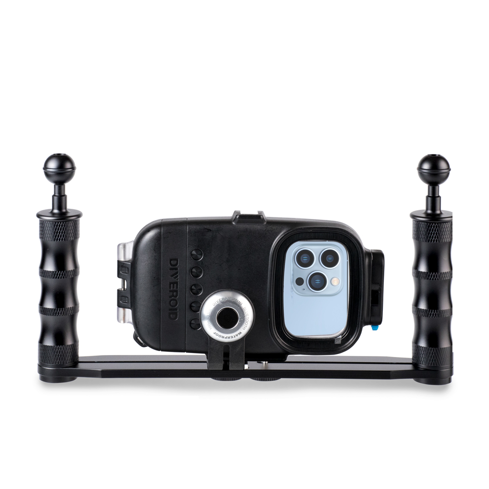 人體工學握把,適用相機寬度26cm,底座雙1/4"螺絲搭配相機、手機潛水殼,不輕易因水流而鬆脫轉動,CNC鋁合金防氧化提籠支架,附25mm球頭支架,可搭配蝴蝶夾、燈臂支架連接LED燈、浮力燈臂,適合進階潛水攝影愛好者。