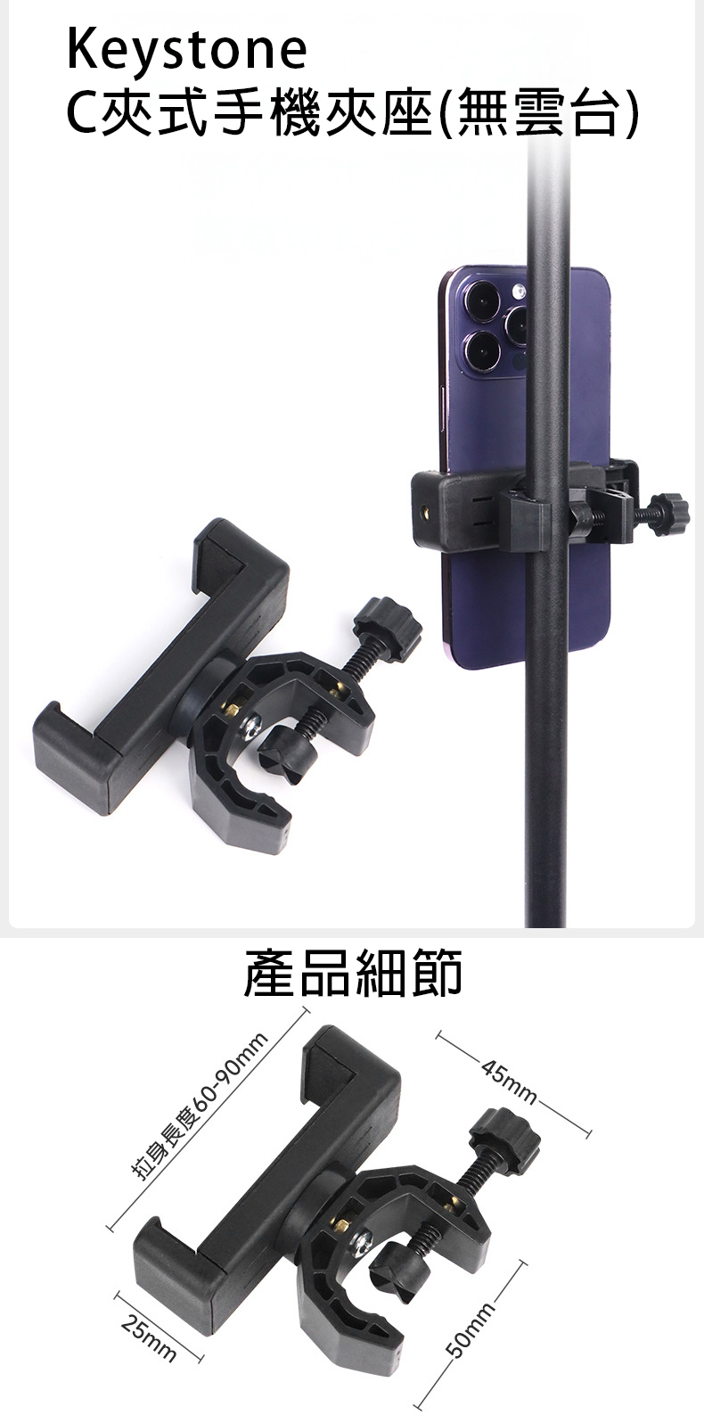 可固定於燈架、腳架或麥克風架上。手機夾可夾寬度6.5~10cm,C型夾最寬可夾寬度2cm。