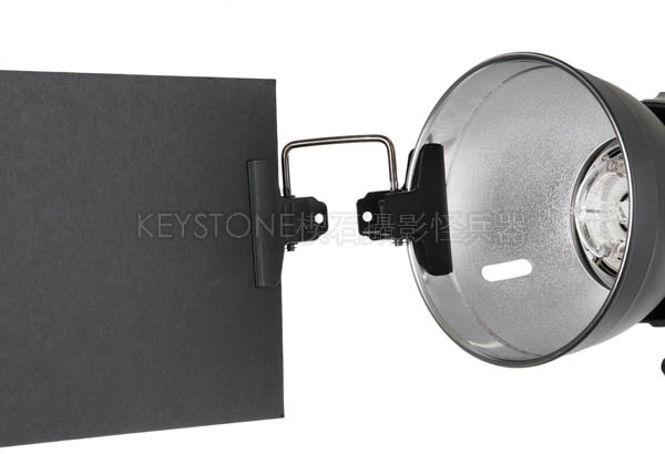 也可夾在標準罩或是四葉遮片上,另一端可夾燈光濾片。