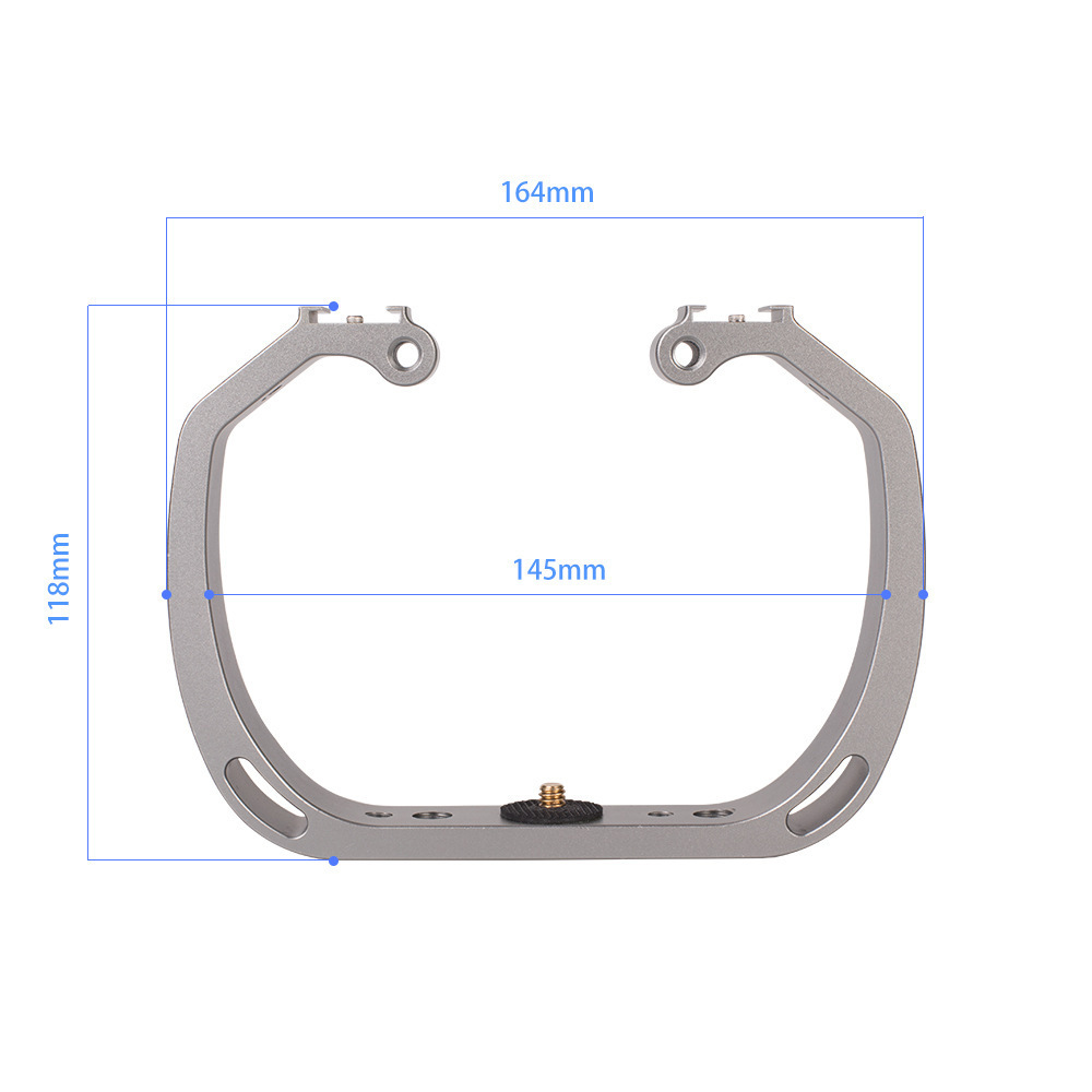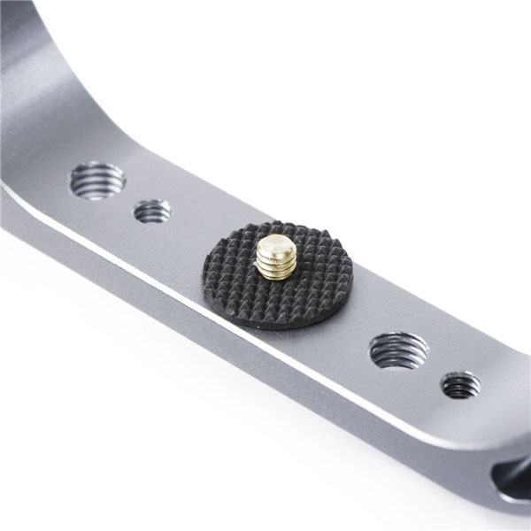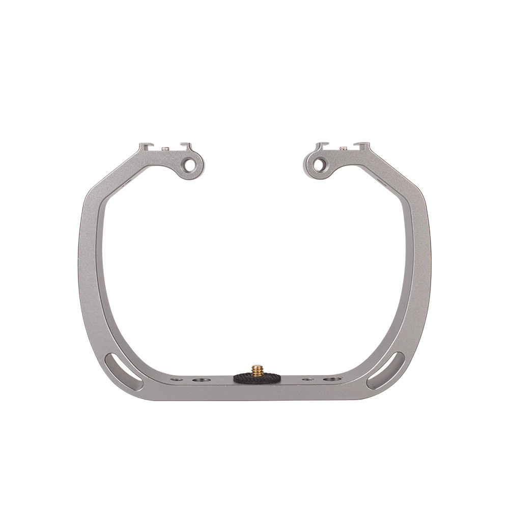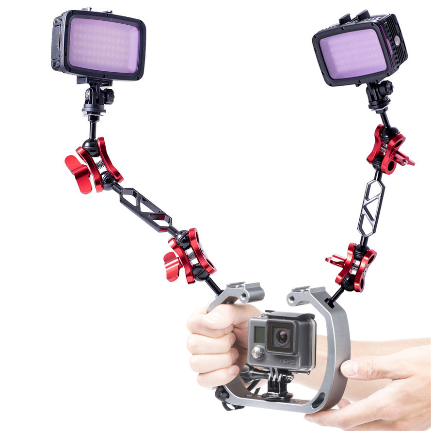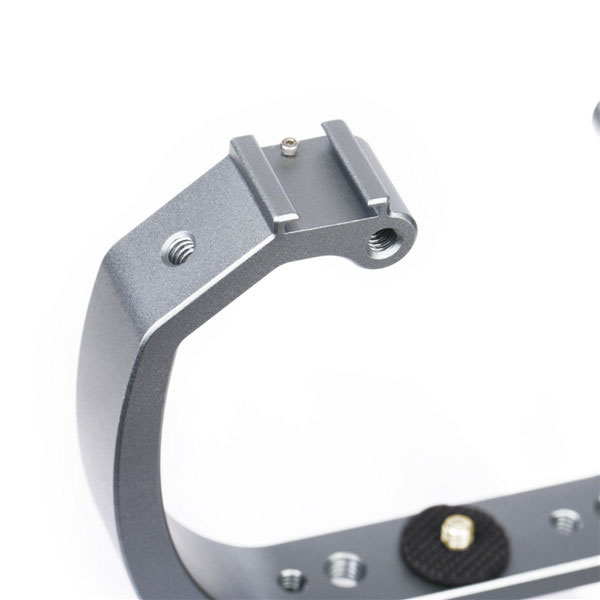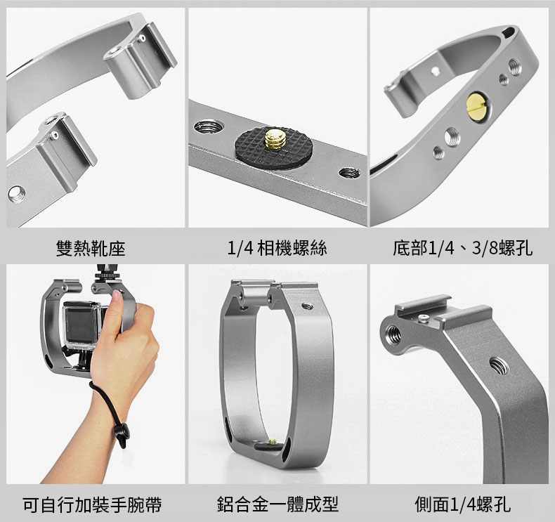 一體成型鋁合金防氧化支架,手持握感極佳,可外接收音設備及補光燈,配置雙熱靴座、1/4"及3/8"螺孔,可加裝支架球頭,搭配蝴蝶夾、燈臂支架可連接潛水用LED燈。