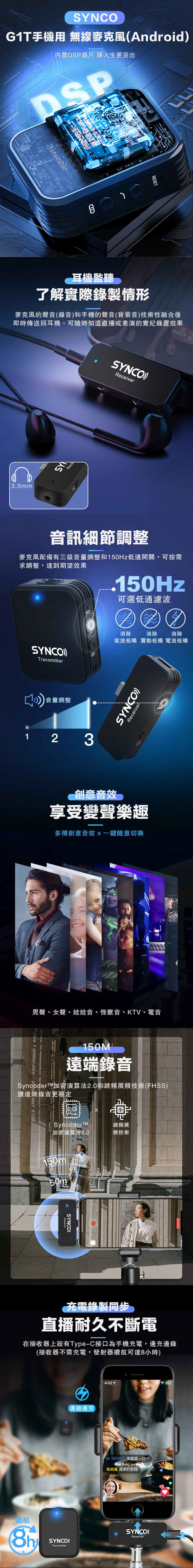 適用於Type-C Android設備,一對二無線收音,可同時錄音、錄製單聲道/立體聲,免去繁瑣後期處理,傳輸距離可達150m,抽屜式無線充電盒,觸點快速充電,內置鋰電池可續航5小時,也支持邊錄製邊充電。高保真聲音、即時耳機監聽、9種變聲特效及智慧降噪晶片,豐富錄影內容,大幅降低背景雜音,維持直播高品質,表面類膚材質耐磨不沾指紋。