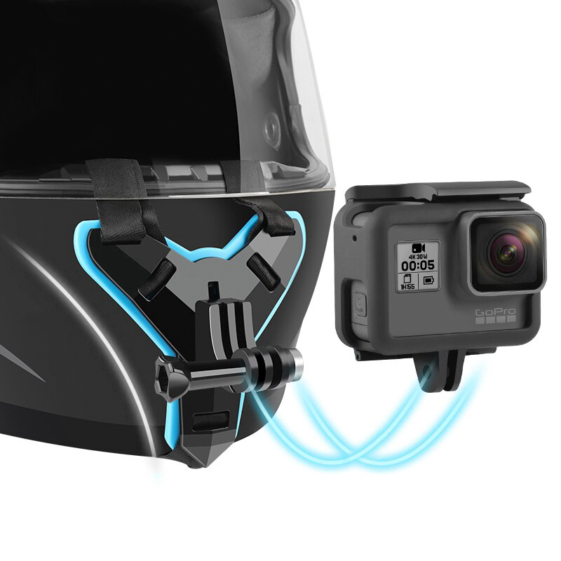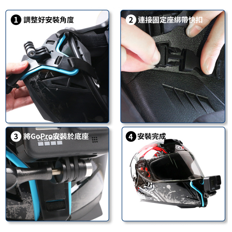 第一人稱騎行視角,TPE防滑橡膠不刮傷安全帽,一體成形底座,快扣式安裝,穿戴脫卸輕鬆方便。適用GoPro或相容運動相機。