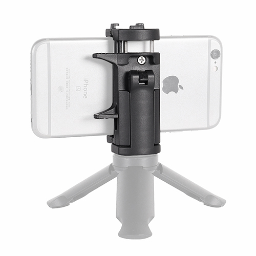 開口寬度:5.7-9.1mm,使用兩指按壓扳扣,即可打開手機夾,放入手機後,放開扳扣,自動夾緊,底部及背後各有一1/4"螺孔,可豎接或橫接,方便用於腳架雲台上。