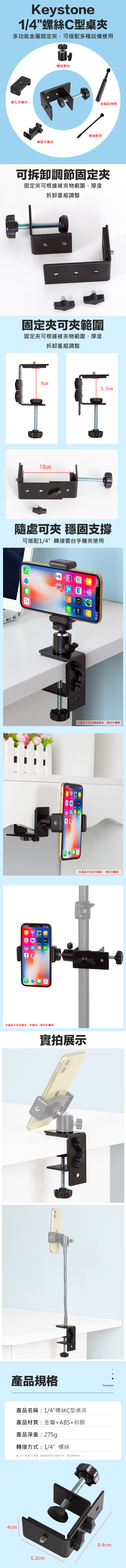 可固定於5.5cm以內桌面/管徑物體上,內含 4個1/4吋螺絲及一個1/4螺孔,可延伸架設手機、平板、小型閃燈…等等。