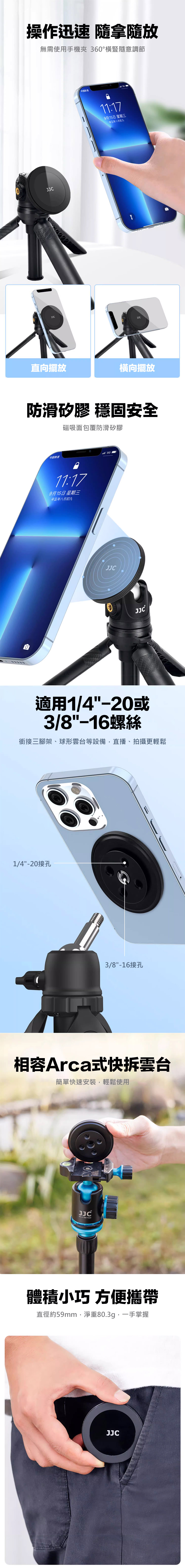 開口寬度:60-88 mm,上下皆設有冷靴座,可任意安裝設備,側邊設有扳扣,按壓即可打開手機夾,可調整角度、豎接/橫接,方便用於腳架雲台上。