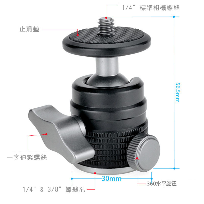 | ▲ 球型關節,可靈活調整方向,直/橫拍攝也不是問題 | ▲ 底部3/8"螺孔,附轉接螺絲,頂部1/4"螺絲可相容多種攝影設備。 | ||||||||||
