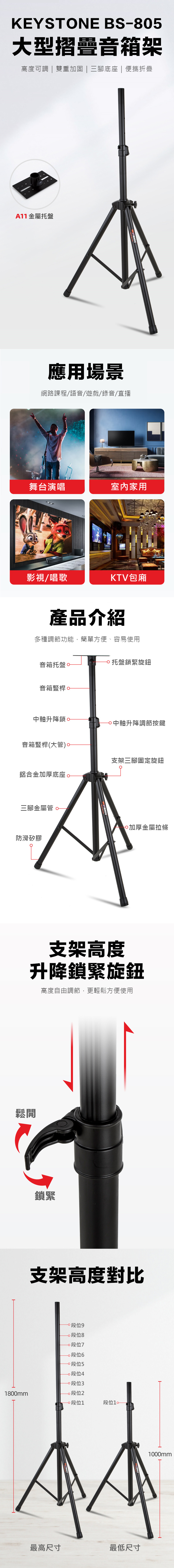 高挑美觀,可調整喇叭高度75-112 cm,立架設有穿線孔,可管理線材、視覺不混亂、好整理;雙重底座、穩固立地,用於架設15kg或8吋以下監聽喇叭