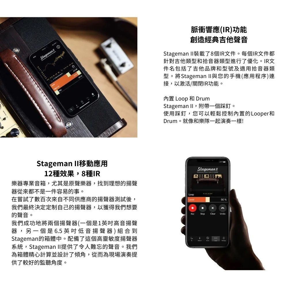 聲脈衝響應。 電池供電 4.5 小時戶外表演。 Drum & Loop(60 年代樂句循環)。 藍牙音頻流。 免費的APP控制器。 USB 固件更新。 |