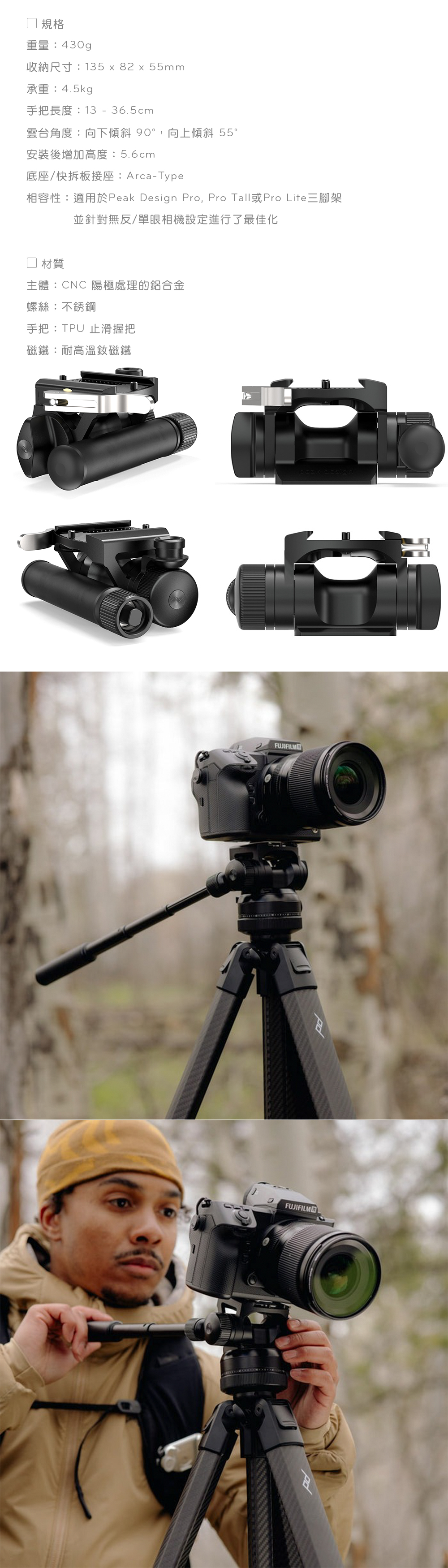專業創作者首選碳纖維腳架,兼顧高度、剛性與收納性,搭載新一代 Pro 球形雲台與流暢翻鎖腳管,從棚拍到外景都能快速架好、穩定開拍。最高高度:168.4 cm,載重:18.1 kg,自重:1.7 kg,材質:碳纖維腳管、鋁合金關節,腳架節數:4,突破性的架構,獨特設計快速架設,專業高水平的穩定性。搭配專屬配件,更加提升拍攝品質的需求。