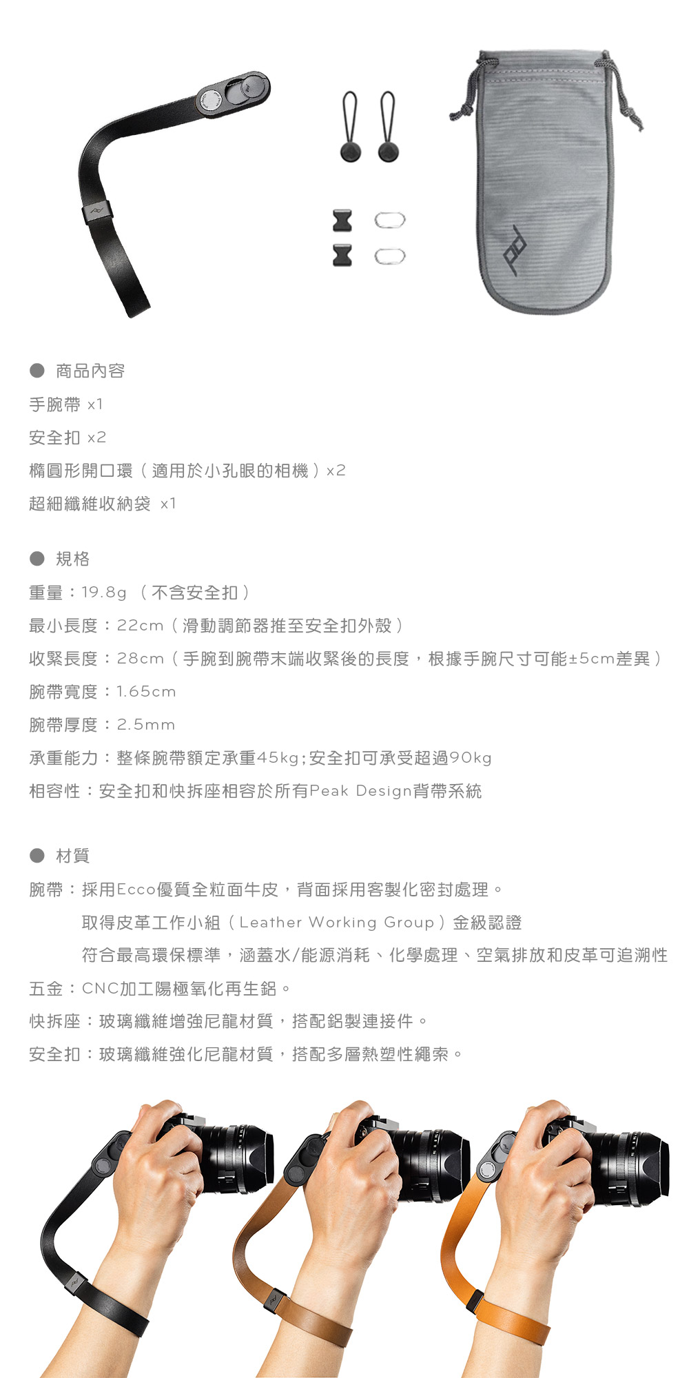鏡頭捕捉瞬間,而皮革記錄生活。選用頂級 LWG 金牌認證全粒面牛皮,無縫線的一體化裁切,呈現如絲綢般的純粹線條。它不只是一條手腕帶,更會隨著每一次按下快門的溫度,醞釀出專屬於你的深邃色澤與手感記憶。底部採用客製化密封處理,以達到最佳滑動/抓握效果。優雅低調的防摔保護,適用於任何尺寸的相機。陽極氧化鋁防滑調節器可在意外跌落時快速收緊。玻璃纖維強化尼龍材質的超薄快拆座外殼,更輕巧俐落。