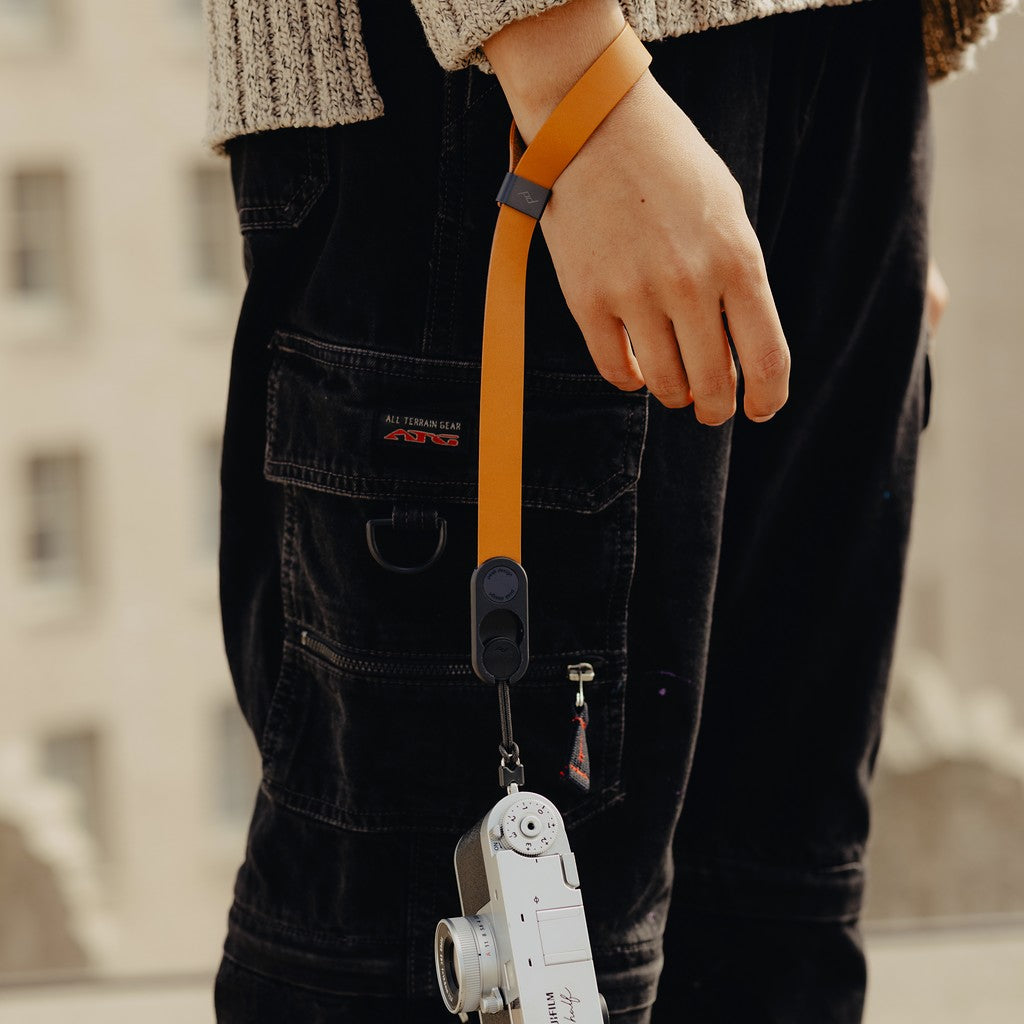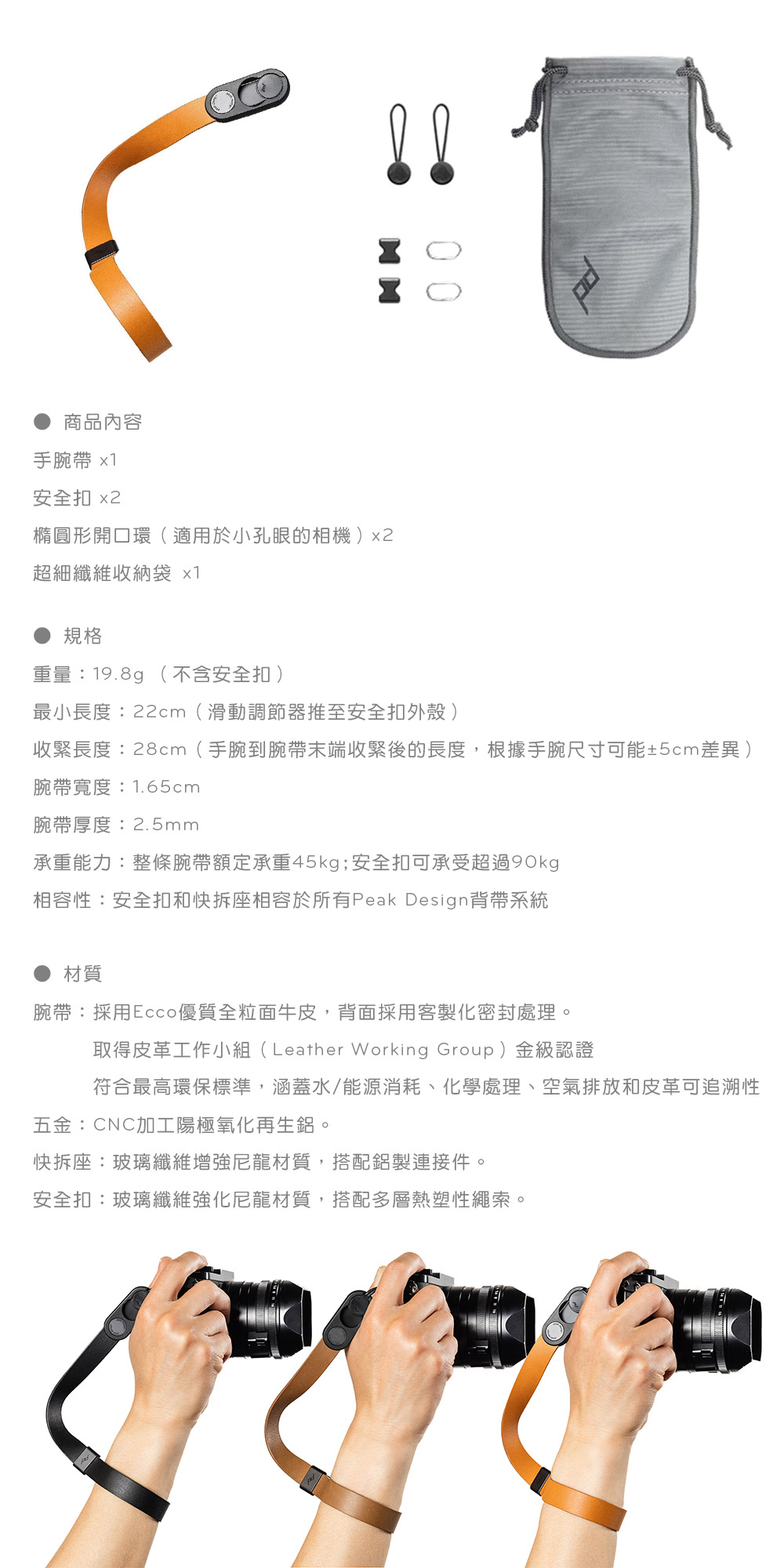鏡頭捕捉瞬間,而皮革記錄生活。選用頂級 LWG 金牌認證全粒面牛皮,無縫線的一體化裁切,呈現如絲綢般的純粹線條。它不只是一條手腕帶,更會隨著每一次按下快門的溫度,醞釀出專屬於你的深邃色澤與手感記憶。底部採用客製化密封處理,以達到最佳滑動/抓握效果。優雅低調的防摔保護,適用於任何尺寸的相機。陽極氧化鋁防滑調節器可在意外跌落時快速收緊。玻璃纖維強化尼龍材質的超薄快拆座外殼,更輕巧俐落。