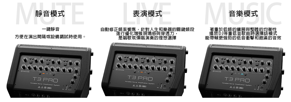 多場景音色預設:一鍵切換,應對自如 T3 Pro 內建三種音色模式,應對不同使用情境: 音樂模式(Music):著重於低頻的擴展與整體的均衡性,播放DJ等重低音歌曲時建議選擇音樂模式,能帶來更強勁的低頻衝擊和飽滿的⾳效。 。 表演模式(Live):自動修正頻率響應,針對人聲與樂器的關鍵頻段進行最佳化,增強現場感與穿透力,是唱歌或彈唱演奏的理想選擇。 靜音模式(Mute):一鍵靜音,方便在演出間隙或裝置調試時使用。 |