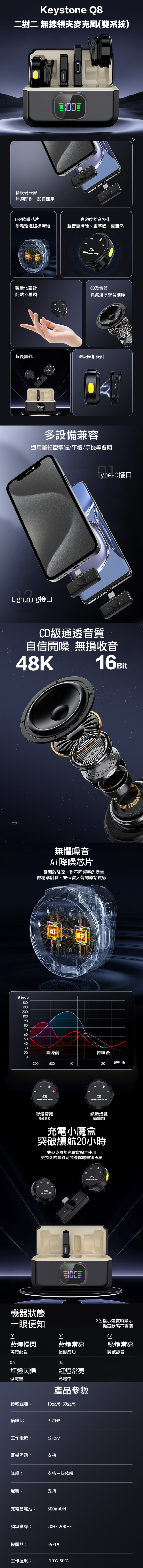適用於Type-C Android設備,一對二無線收音,可同時錄音、錄製單聲道/立體聲,免去繁瑣後期處理,傳輸距離可達150m,抽屜式無線充電盒,觸點快速充電,內置鋰電池可續航5小時,也支持邊錄製邊充電。高保真聲音、即時耳機監聽、9種變聲特效及智慧降噪晶片,豐富錄影內容,大幅降低背景雜音,維持直播高品質,表面類膚材質耐磨不沾指紋。