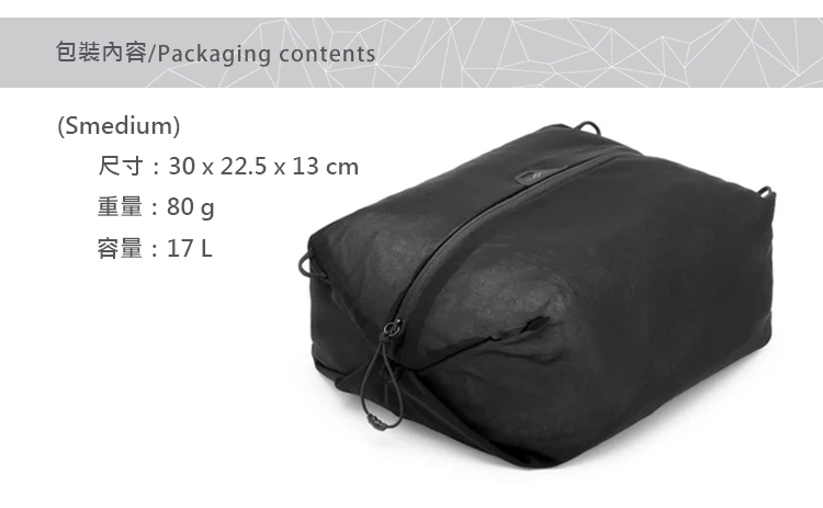 超強、超輕、超可收納的鞋袋為鞋子或衣服,獨立放置不用擔心髒衣物、鞋底髒污弄髒行李。適用於任何行李箱或手提袋, 可放1-2雙鞋,尺寸可與Peak Design Travel Line系列完美搭配。 採用70D尼龍布製成,重量48g。 當您不使用鞋袋時,輕鬆收折至一個手掌大小,輕易放進口袋或後背包不占空間。