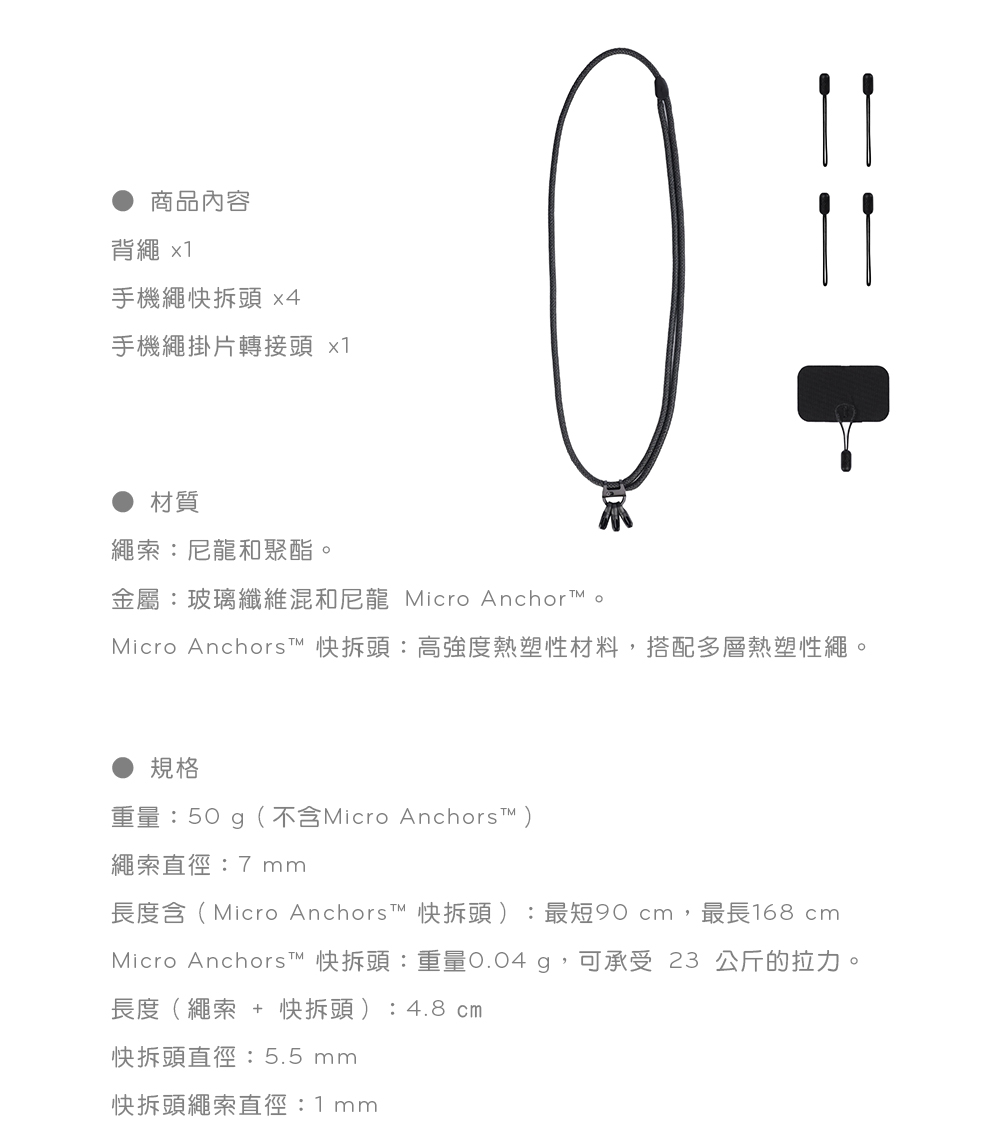 專為輕便出行設計的隨身系統。繩索採用高品質的尼龍與聚酯纖維混編,兼具耐用性與親膚觸感。其獨特的掛載模組設計,可同時扣上三個小物,讓你輕鬆整合手機、藍牙耳機、鑰匙或小型手電筒,實現真正的雙手自由。無論是城市通勤還是戶外散步,這條背繩都能讓你的必備小物井然有序,隨手可得。(本產品專為小型及輕型器材設計,不建議掛載大型或重型設備,以確保佩戴的舒適度與器材安全性。)