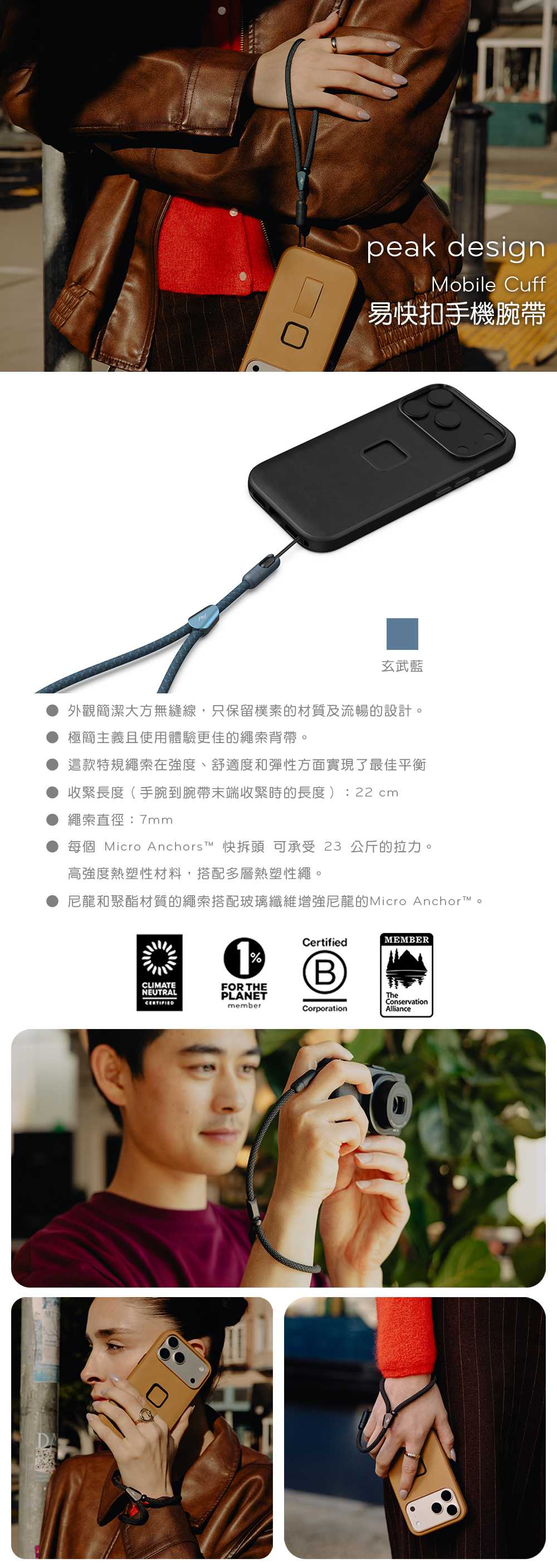採用堅韌的尼龍與聚酯纖維混編,觸感細膩且耐磨。專為小型及輕型器材設計,無論是手機還是隨身數位相機,都能穩固掛載於腕間,有效防止意外滑落,讓你在拍攝或移動時更加從容。輕便、靈活且不佔空間,是您日常街拍或城市探索時最可靠的防掉落夥伴。(本腕帶專為輕巧設備打造,不適合掛載大型或重型器材,以維持佩戴的舒適性與安全性。)