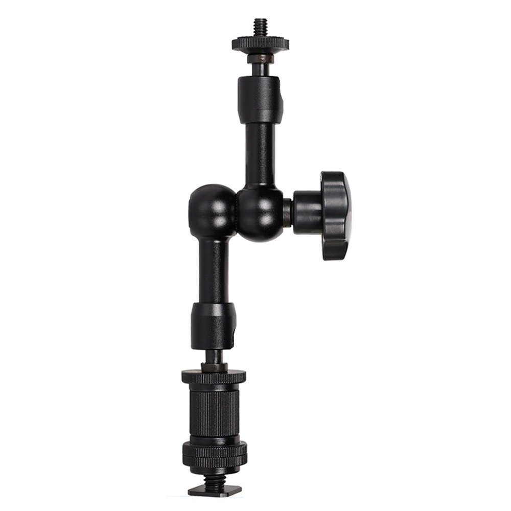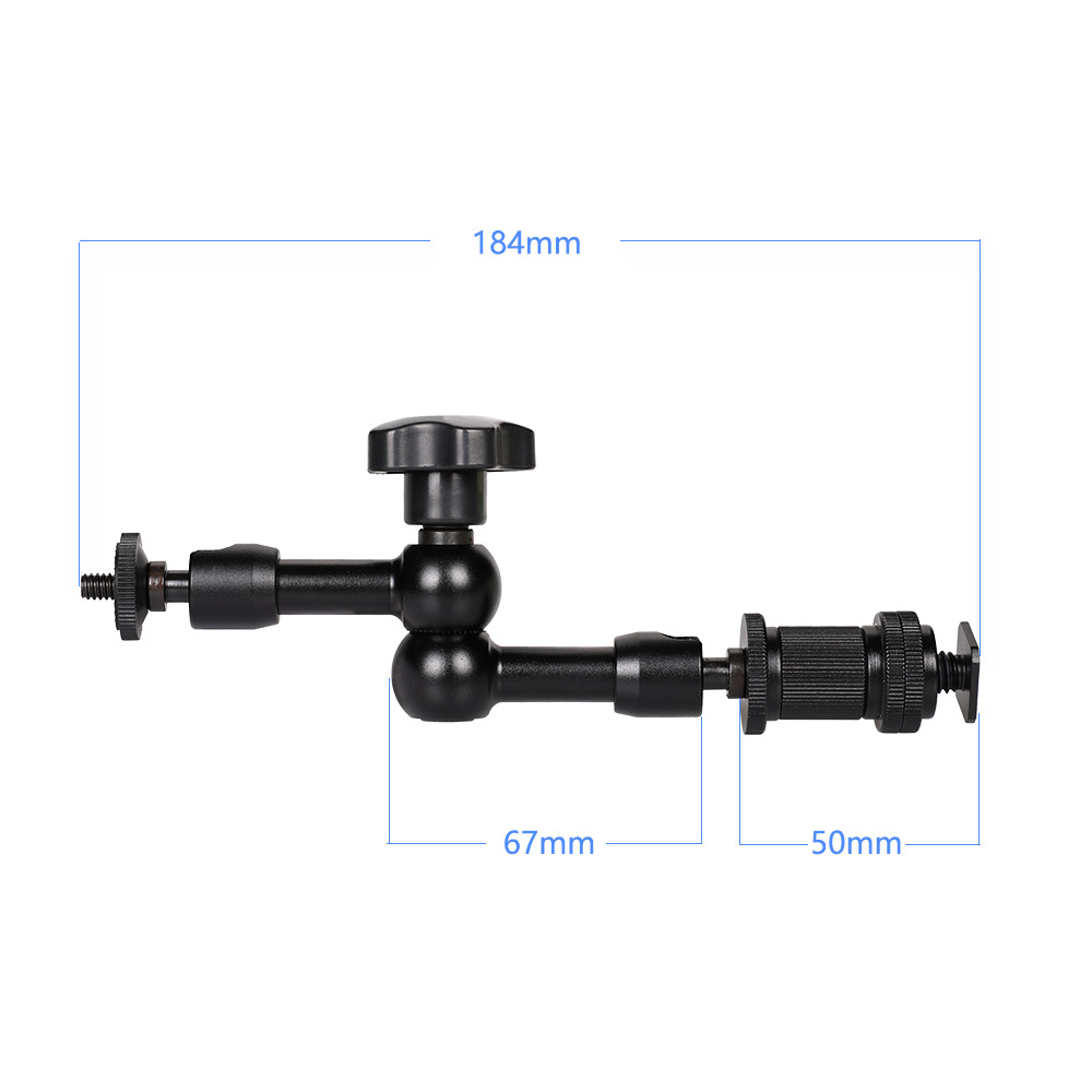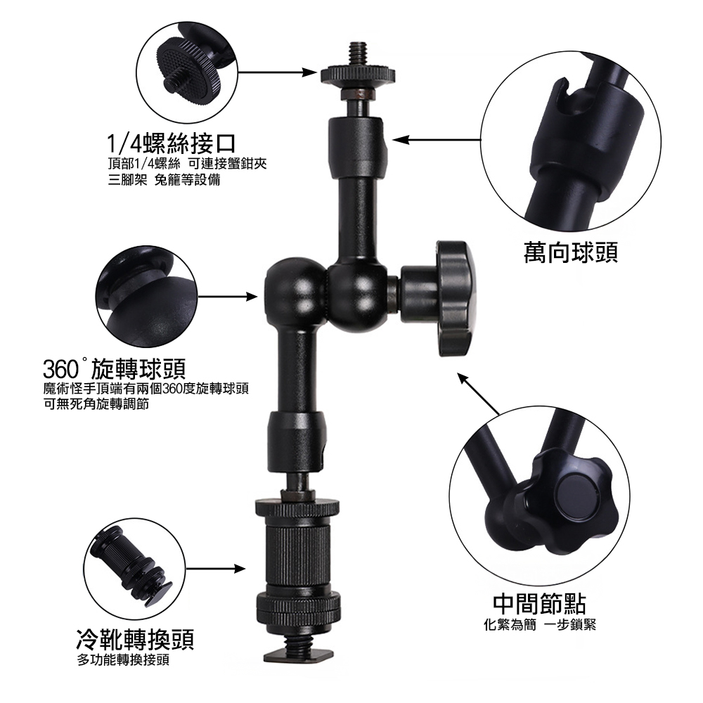 184mm怪手,旋鬆後三個關節都可任意調整角度,底部可轉換1/4螺絲或熱靴,可架設承架、相機上方,適用於延伸安裝其他設備,像是外接螢幕、麥克風、補光燈等等,上段長度約70mm下段長度(含熱靴座)約120mm,自重168g,承重2kg。 |