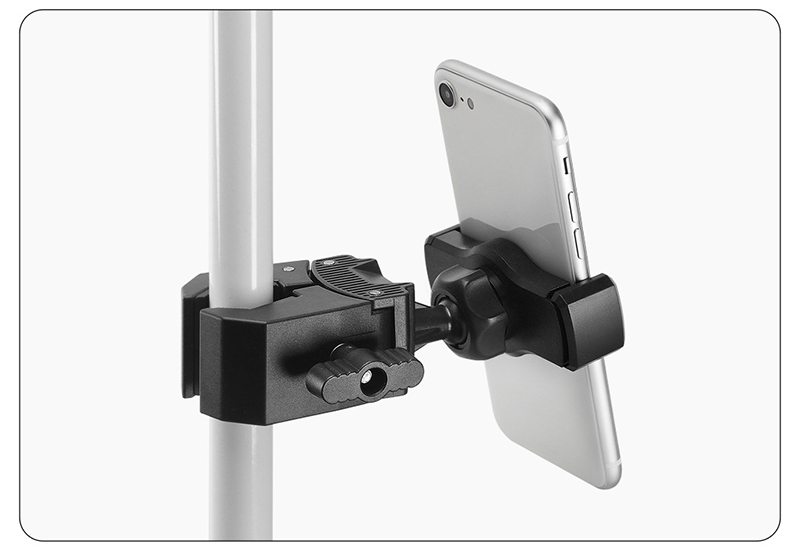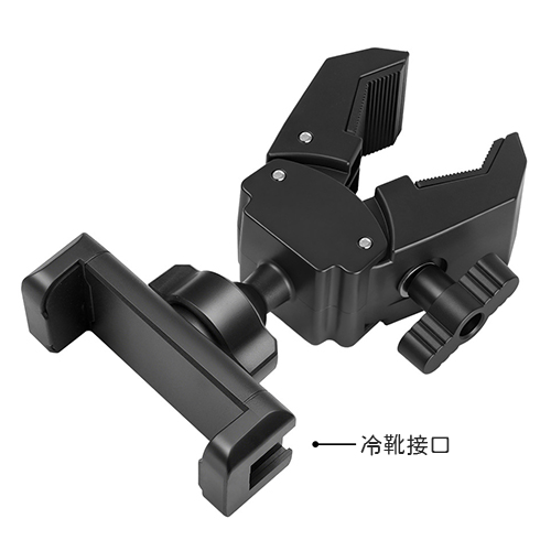 可夾管徑13mm-47mm管柱,手機夾可夾寬度60-100mm,其中一端含有冷靴接口,材質為尼龍。 |