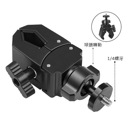 可夾管徑13mm-47mm管柱,末端為球頭跟1/4螺牙,可搭配GoPro或手機小型設配使用。 |
