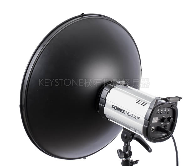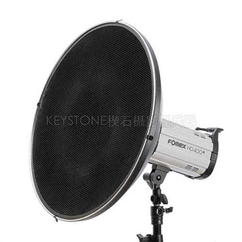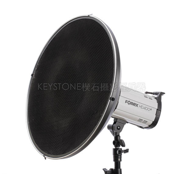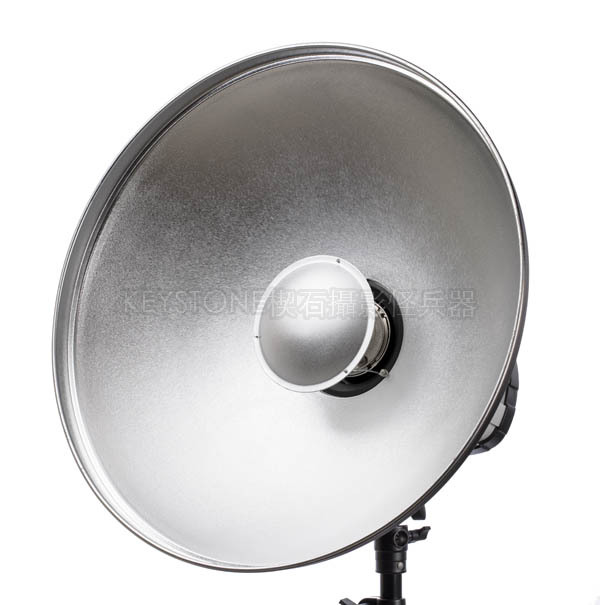 Keystone 69 雷達罩(Bowens) +蜂巢 銀色雷達罩相較白色雷達罩光質呈現較硬,可打出硬中帶柔的光源,非常能表現出質感,常用於時尚人像、服裝攝影的主要光線,處理細節層次更優,表現彩妝效果佳。